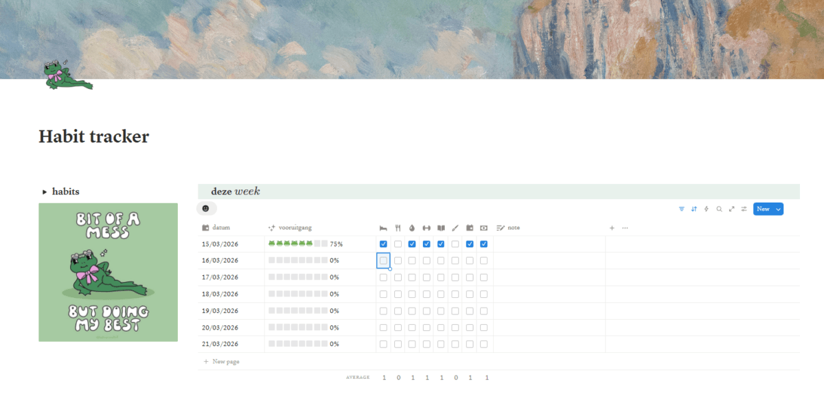 Daardoor besloot ik ’s avonds om mijn gewoontes terug te tracken in Notion. Ik vond een leuke template die ik wat aanpaste en zette direct een widget op mijn telefoon, zodat ik het makkelijker kan volhouden om alles bij te houden.